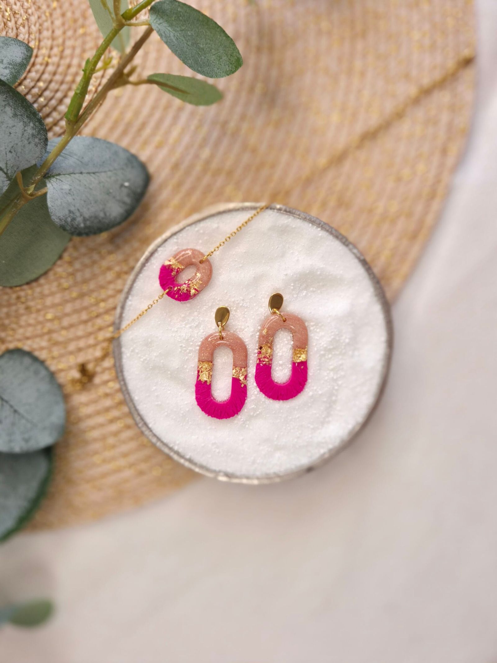 De combinatie van de fuchsia kleur met de transparante delen in deze sieraden maken dat deze de eyecatcher zijn van jouw outfit. De textuur in de fuchsia delen zorgen voor een speels effect en een unieke uitstraling. Deze set is handgemaakt en daardoor ben jij er van verzekerd dat je nooit iemand zult tegenkomen met dezelfde mooie set.
